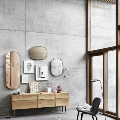 Menšie zrkadlo z kolekcie nástenných dekoratívnych zrkadiel s výrazným zaobleným rámom vyrobila pre značku Muuto dvojica nórskych dizajnérov Anderssen & Voll.